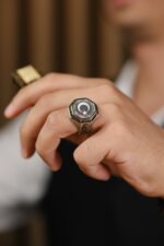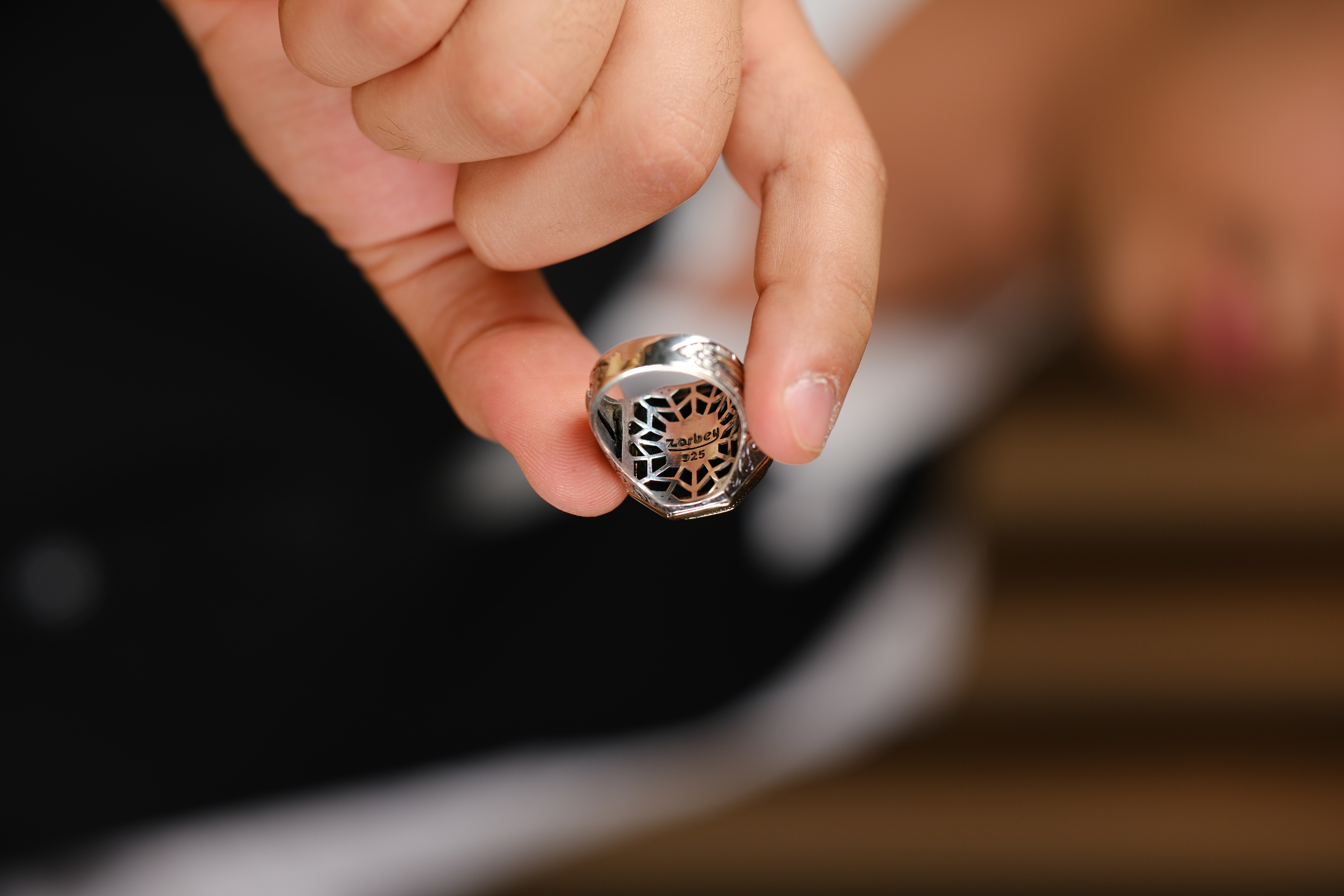 925 ayar gümüşten üretilmiş gövde, yüzüğe hem sağlamlık hem de uzun ömürlü bir kullanım sunar. Çevresine işlenen ince detaylar, ustanın el izini taşıyan özel motiflerle birleşerek yüzüğü benzersiz kılar. Sekizgen formdaki hatlar, gücün ve düzenin simgesi olarak tasarıma ek geometrik bir karakter kazandırır.