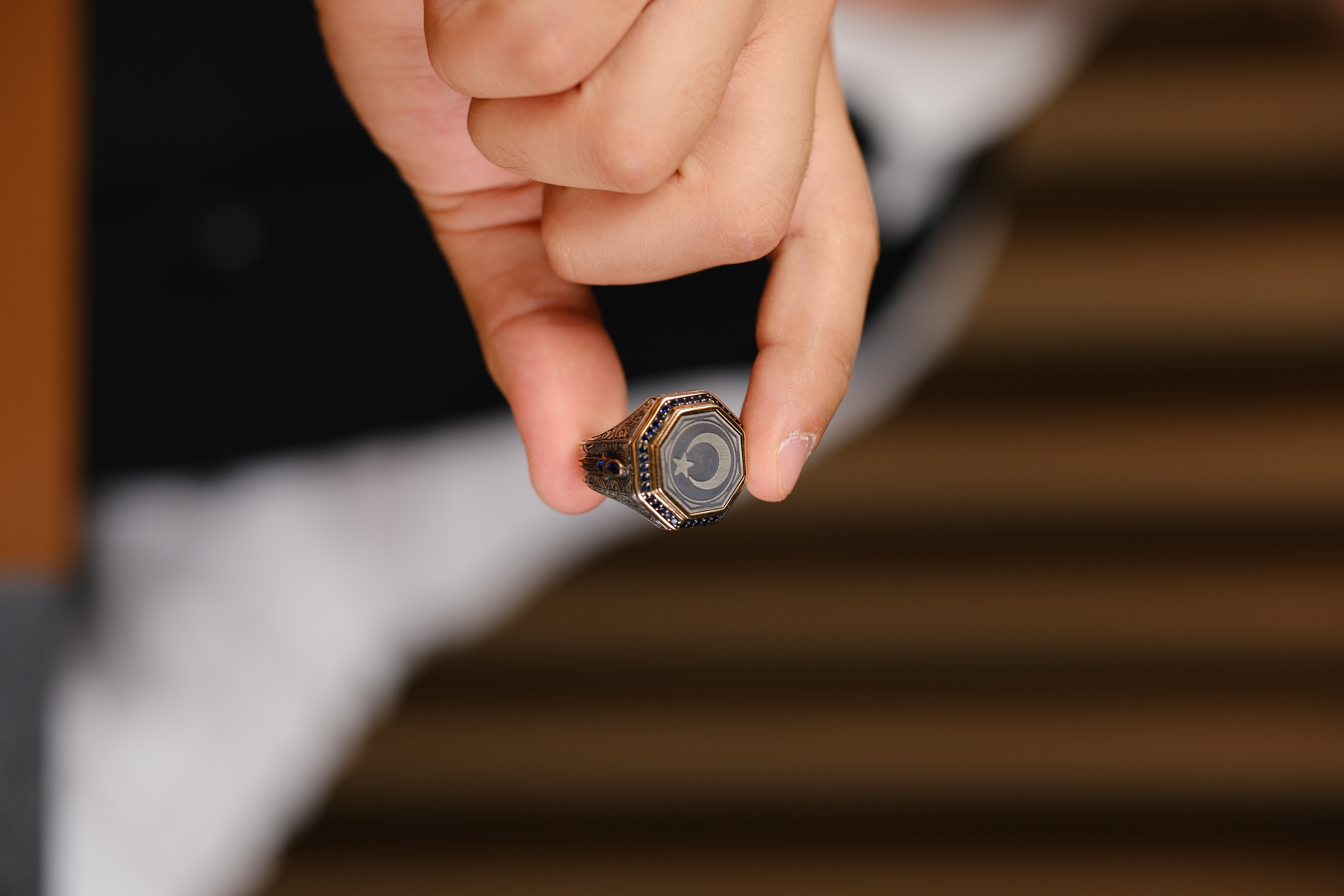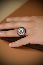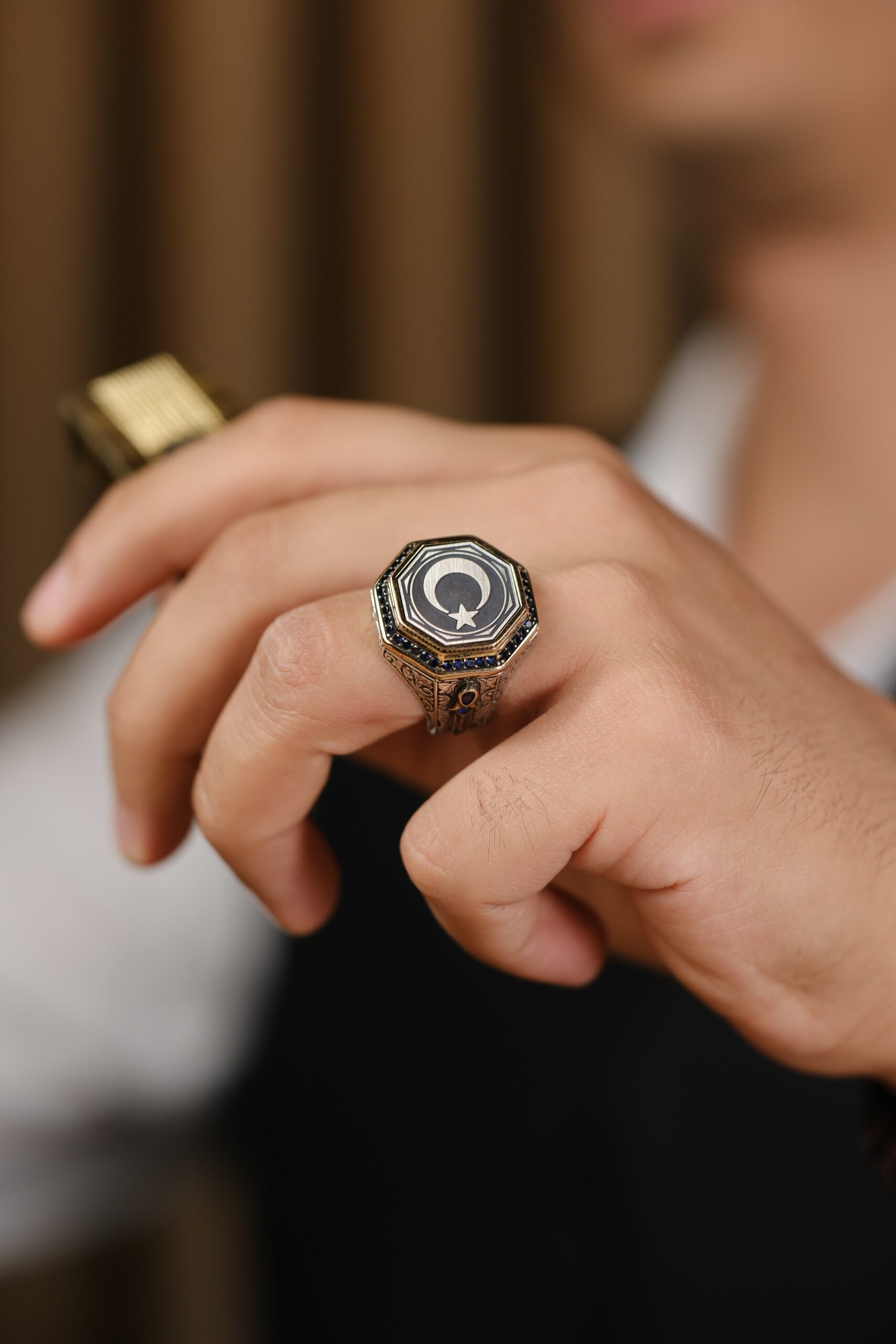 Yüzüğün üst kısmında yer alan ayyıldız, asaleti, özgürlüğü ve köklü bir geçmişi temsil ederken; siyah taşın güçlü dokusu tasarıma gizemli ve karizmatik bir hava katar. Siyah taş, koruyucu enerjisiyle bilinir; zihinsel netlik, kararlılık ve güç duygusunu destekleyen yapısıyla hem estetik hem ruhsal anlamda etkileyici bir merkez oluşturur.