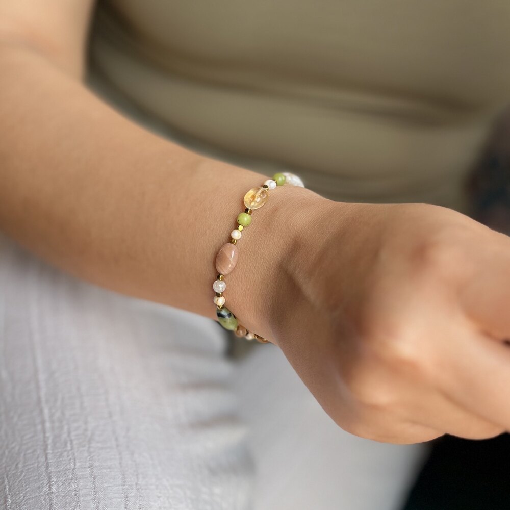 Yeşim’in huzuru, Sitrin’in neşesi, Güneş taşının cesareti ve Hematit’in kararlılığı bir araya geldiğinde, ortaya hem zarif hem de enerjisi dengeli bir bileklik çıkar. Bu bileklik, sadece görsel bir şıklık sunmakla kalmaz; ruhu besler, enerjiyi dengeler ve taşıyana içsel güç ile pozitif bir yaşam akışı armağan eder.