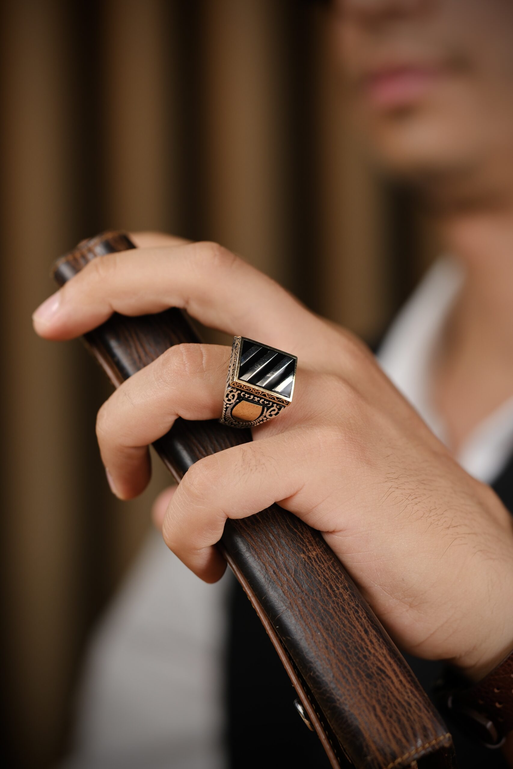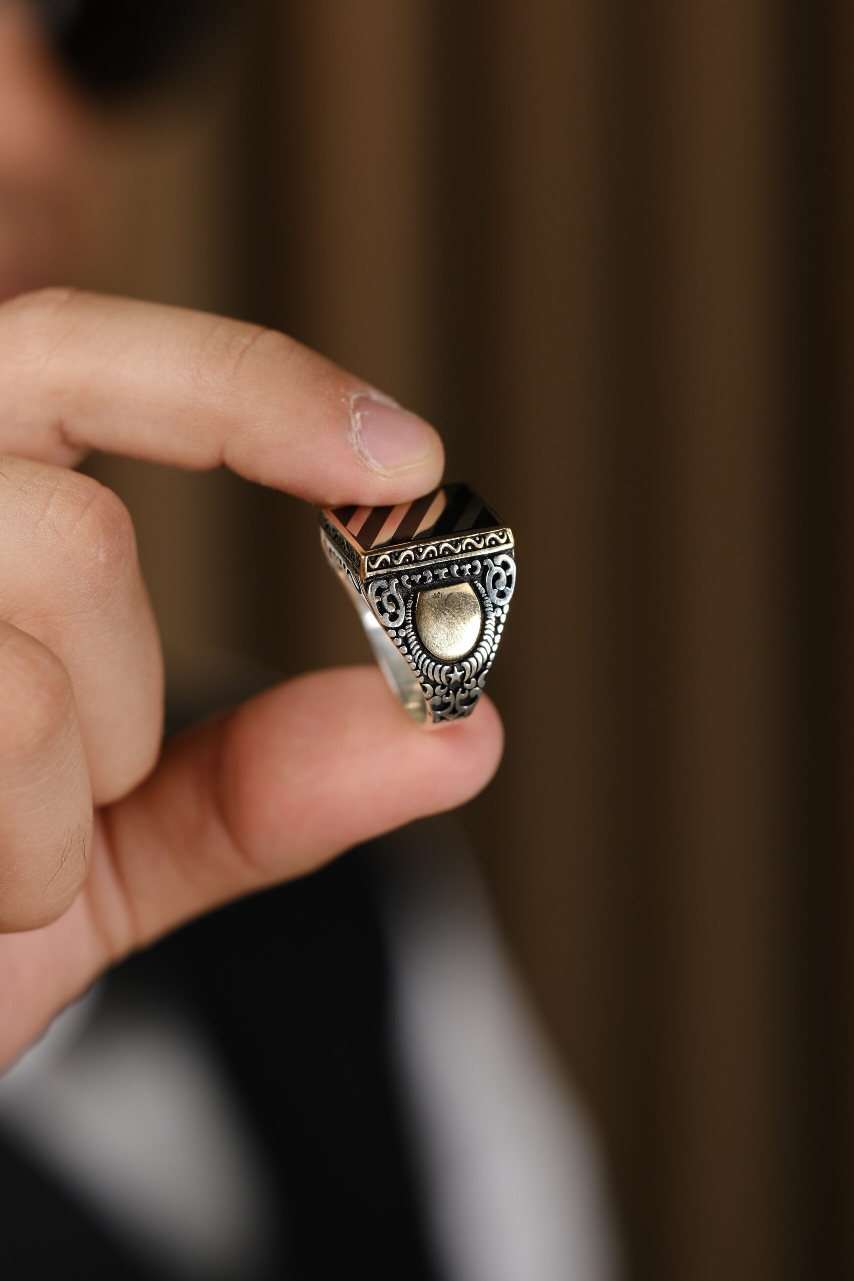 Gövdesindeki detaylı işçilik, her çizgide bir otorite ve duruş hissi verirken; yüzüğün genel formu modern ve klasik çizgiyi bir arada sunar. Bu sayede hem özel günlerde hem günlük kullanımda stilin tamamlayıcı parçası hâline gelir.