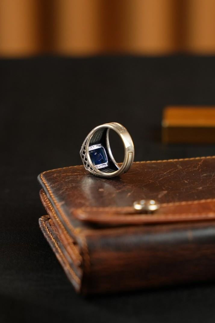 Yüzük, 925 ayar gümüş kullanılarak üretilmiştir. Gümüşün doğal parlaklığı, mavi taşın dikkat çekici rengiyle buluşarak güçlü ve dengeli bir görünüm oluşturur. Tamamı el işçiliği olan bu özel tasarımda her detay özenle işlenmiş olup, her yüzük kendine özgü bir karakter taşır.