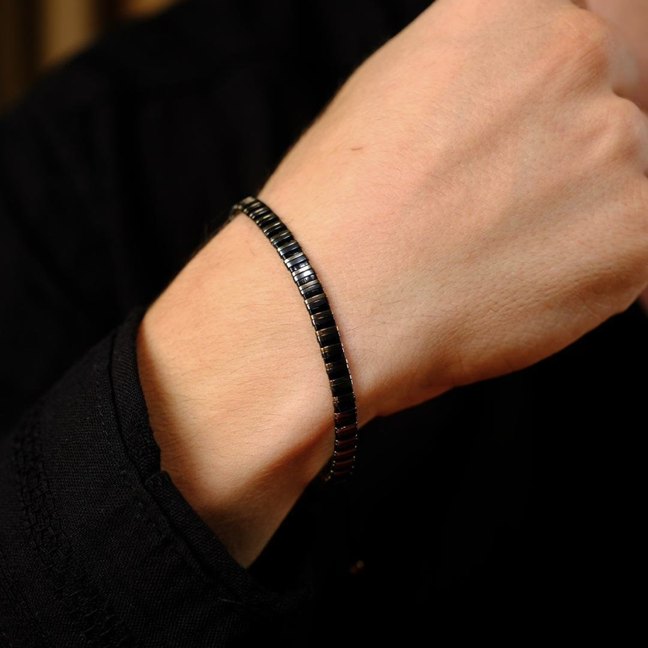Bu özel bileklik, tamamen Hematit taşlarının koruyucu ve dengeleyici enerjisinden oluşan güçlü bir maskülen ifadeye sahiptir. Hematit, siyahın derinliğini yansıtan parlak yüzeyiyle sadece şık bir görünüm sunmakla kalmaz; aynı zamanda enerjiyi kökleyen, zihni berraklaştıran ve kişinin içsel duruşunu güçlendiren kadim bir taştır. Bu taş, taşıyan erkeğe sükûnet ve kararlılık kazandırır; yoğun temposu içinde dengesini korumasına, düşüncelerini netleştirmesine ve daha sağlam adımlar atmasına yardımcı olur.