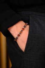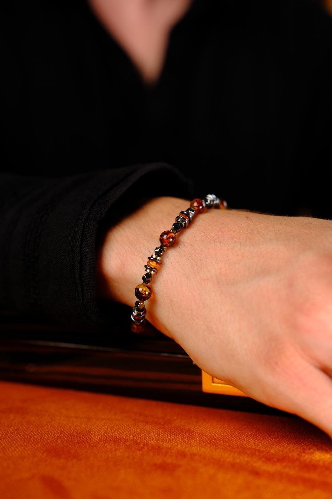Bu iki taş bir araya geldiğinde, damla kehribarın sıcak, pozitif enerjisi ile hematitin topraklayıcı ve odaklayıcı gücü, eşsiz bir uyum oluşturur. Hem şıklık hem de enerji açısından tamamlayıcı bir birliktelik sunan bu tasarım, hem gündelik kullanımda hem de özel anlarda fark yaratır. Her bileklik, sadece bir aksesuar değil; aynı zamanda taşıyan kişiye huzur, güç ve denge sunan bir enerji kaynağıdır.
