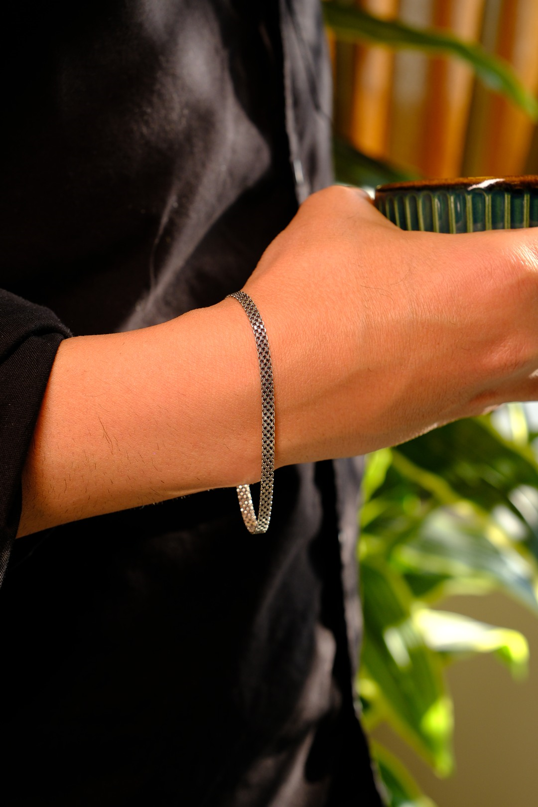 925 ayar gerçek gümüşten üretilen bu özel tasarım, hem sağlam yapısı hem de minimal şıklığıyla günlük kullanım için idealdir. Her bileğe uyum sağlayan formu sayesinde konforlu bir deneyim sunarken, zarif dokusu ile maskülen bir karakter oluşturur.
