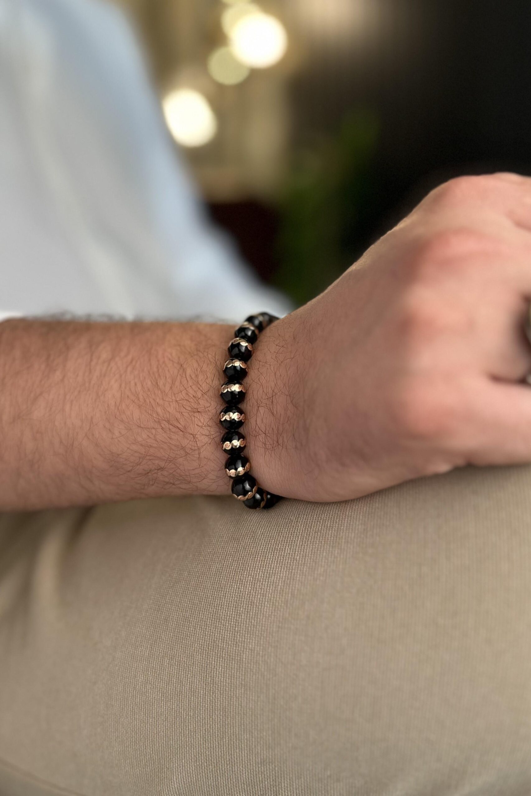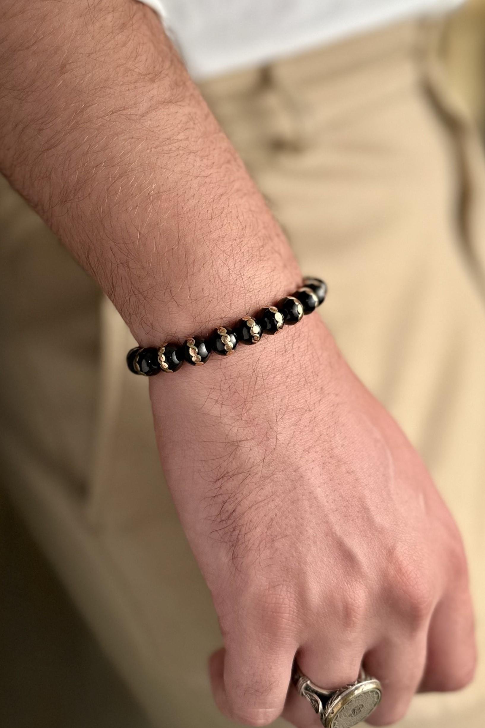 Doğal taşların gücünü zarif işçilikle bir araya getiren bu özel tasarım, olgun bir duruşu ve güçlü bir enerjiyi aynı anda taşır. Parlak siyah yüzeyi ve kendine has dokusuyla Oltu taşı, yüzyıllardır koruyucu nitelikleriyle bilinen, nadir bulunan bir Anadolu mirasıdır. Bu bileklikte ise her bir Oltu taşı, pirincin sıcak ve asil tonlarıyla sarılarak modern bir maskülen stile dönüştürülmüştür.
